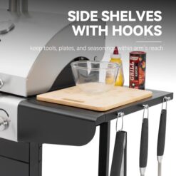 - Two side shelves keep your grill tools, plates, and seasonings within arm’s reach, offering extra prep space; 3 hooks are integrated on both sides for hanging grill accessories.