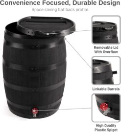 RTS Home Accents Premium 55-Gallon Eco Rain Barrel with Removable Lid, Flat Back Rain Water Collection Barrel, Made with 100% Recycled Plastic, Black