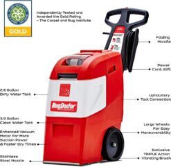 Clean with the power of the Pros with the Rug Doctor X3 Commercial Carpet Cleaner. One pass cleaning system delivers commercial-grade results – just spray, scrub and extract. Here’s how it works: first, powerful jets inject cleaning solution deep into the carpet to break down dirt and grime. Next, our exclusive triple-action vibrating brush scrubs all sides of each carpet fiber to release embedded dirt, stains, and odors that other machines miss. Last, our powerful vacuum motor delivers pro-grade suction power to extract the dirt, stains and odors and aid in faster drying times. More than twice the capacity of many machines, the X3 Commercial Carpet Cleaner has a 2.5-gallon solution tank and 4-gallon dirty water tank for more cleaning time and less filling and emptying. With its large wheels, you can roll it almost anywhere – fold the handle down for easy storage. It’s no wonder this machine was rated GOLD by the CRI (carpet and Rug Institute) for soil removal, water removal and gentles on carpet – guaranteed not to void your carpet warranty. Each machine includes one 48oz bottle of Oxy Carpet Cleaner for superior cleaning results. For added versatility, pair with the handheld upholstery scrubber tool (sold separately) to tackle stains on most couch cushions, stairs, rugs, pet beds, corners and hard-to-reach places with ease. 1-Year Consumer and Commercial Warranty.