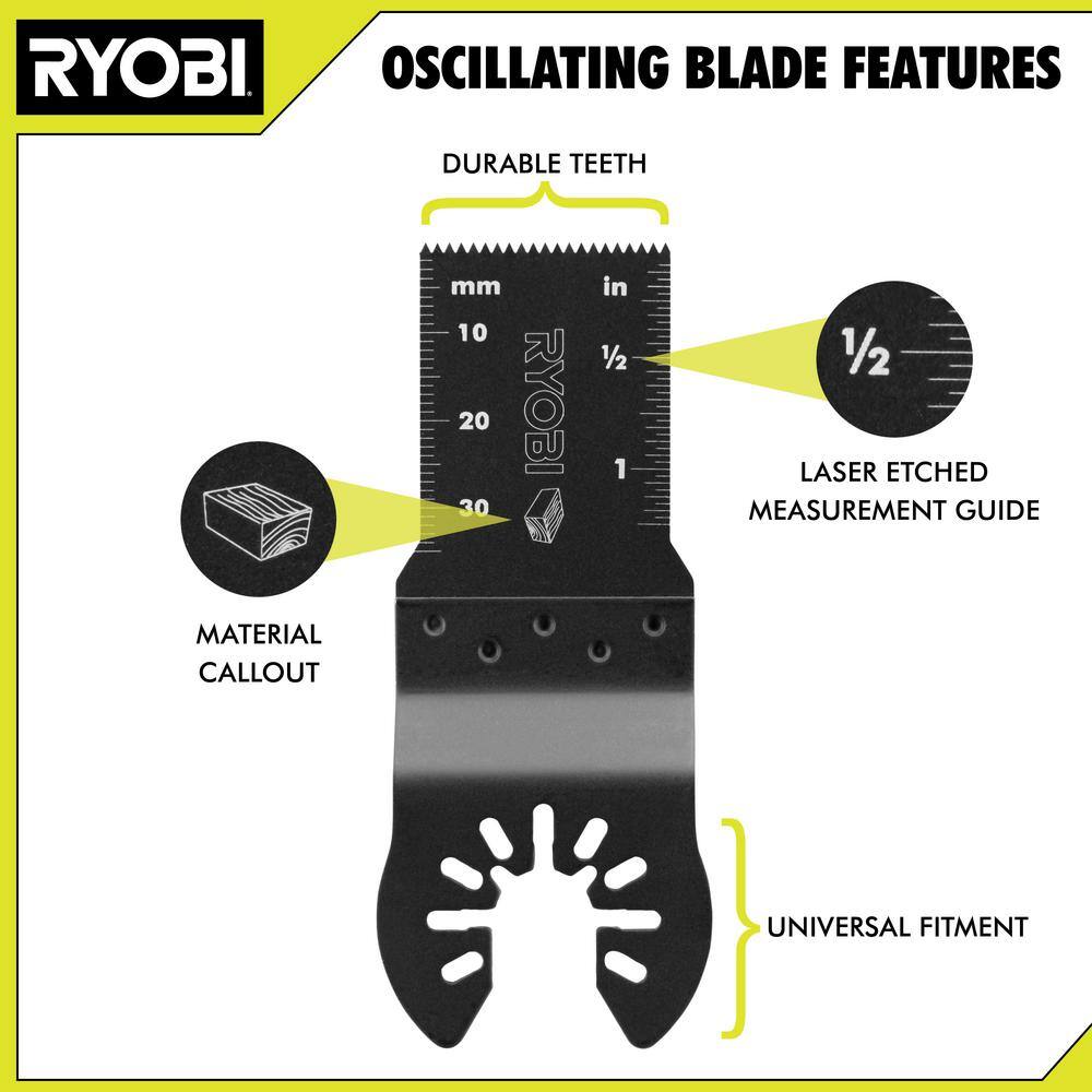 RYOBI introduces the 16-Piece Oscillating Multi-Tool Blade Accessory Set. These blades have a specialized fitment that allows them to fit most multi-tools without needing an adapter. This 16-Piece blade set is complete with blades for cutting wood, metal, plastic, tile, grout, fiberglass, drywall, masonry and concrete. This allows the user the ability to complete a variety of jobs and projects. The Wood Plunge Cut Blade is made from premium high carbon steel, providing users with 35% faster cutting speeds. A storage case is also included for organization of the blades. This kit includes (2) Wood Plunge Blade, (2) Wood/Metal Plunge Blade, (2) Wood/Metal Flush Cut, (1) Wood/Drywall Flush Cut Blade, (1) Rigid Scraper, (1) Flexible Scraper, (1) 1/16 in. Grout Removal Blade, (1) Carbide Triangle Scraping, (1) Japanese Tooth Blade, (1) 3/8 in. Offset Blade, and (3) Large Sandpaper (60 Grit, 120 Grit, and 240 Grit).