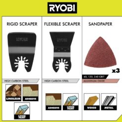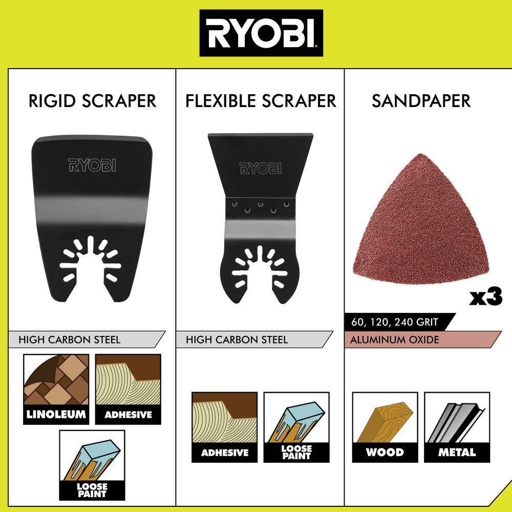 - Includes: (2) Wood Plunge Blade, (2) Wood/Metal Plunge Blade, (2) Wood/Metal Flush Cut, (1) Wood/Drywall Flush Cut Blade, (1) Rigid Scraper, (1) Flexible Scraper, (1) 1/16 in. Grout Removal Blade, (1) Carbide Triangle Scraping, (1) Japanese Tooth Blade, (1) 3/8 in Offset Blade, and (3) Large Sandpaper (60 Grit, 120 Grit, and 240 Grit)