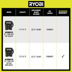 The RYOBI 42 in. 2-Bin Soft Top Bagger with Boost is the perfect fit for the RYOBI 80-Volt HP 42 in. Lithium Electric Zero Turn Mower. Included are two 21 in. replacement bagging blades for Electric Zero Turn Mowers and the nylon mesh bagging bins for superior airflow and unmatched bagging performance. With 7.75 cu. ft. of capacity, these independent bagging bins discharge grass clippings easily and efficiently. This bagger comes with a bagger boost option that sends a gust of air at 700 CFM to help clear the chute of any potential clogs with just a press of a button. Also included are the high density poly ethaline tubes, specifically designed to maximize efficiency and optimize run time for RYRM8021. Installation of this bag is quick and easy so you can get back to maintaining your lawn.