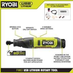 RYOBI introduces the USB Lithium Screwdriver and Rotary Tool Kit. This screwdriver features a pivoting head for increased accessibility during every application. The on-board bit storage prevents losing bits and ensures convenience. The dual LED worklight create extra visibility for all your project’s needs. The rotary tool features a compact design that delivers more power for any application. The new innovative QuickChange Collet with 4X faster accessory changes, which makes switching accessories quick and easy. This kit comes with 15 accessories for a variety of applications such as carving, sanding, polishing and more.The USB Lithium Screwdriver and Rotary Tool Kit is a part of the USB Lithium System that provides compact, portable, rechargeable solutions for cordless power and productivity. This USB Lithium Screwdriver and Rotary Tool Kit is backed by the RYOBI 2-Year Manufacturer’s Warranty and includes (1) Screwdriver, (2) USB Lithium Batteries, (2) Bits, (2) USB Cables, (15) Rotary Tool Accessories, (1) Wrench, (1) Accessory Storage Case, and Operator’s Manuals.