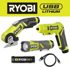 The RYOBI USB Lithium 3-Tool Combo Kit will elevate your projects with rechargeable power for everyday solutions. Featuring a pivoting head and LED worklight, the USB Lithium Screwdriver allows for increased visibility and accessibility. The USB Lithium Compact LED Flashlight provides 600 lumens of light output and is IP54 water and dust resistant. With a self-sharpening blade, the USB Lithium Power Cutter powers through a variety of materials. The included USB Lithium 2Ah battery features a USB-C port that also charges mobile devices, and a LED fuel gauge that clearly indicates the battery level status with the press of a button, eliminating guess work. These products also feature an LED indicator to signal when the battery is charged (green) or has low battery (red) while in-use. Best of all, it is part of the RYOBI USB Lithium System of tools that provides compact, portable and rechargeable solutions for cordless power and productivity. This USB Lithium Tool 3-Tool Combo Kit is backed by the RYOBI 2-Year Manufacturer’s Warranty and includes a USB Lithium Screwdriver, Power Cutter, Compact LED Flashlight, USB Lithium 2Ah Battery, USB Cable, Screwdriving Bits, Pre-Installed Power Cutter Blade, and Operator’s Manuals.