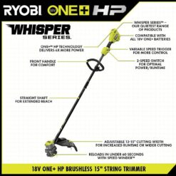 The RYOBI 18V ONE+ HP 15 in. String Trimmer truly harnesses the power of 18V ONE+. It has a brushless motor for maximum power and durability and as part of our WHISPER SERIES it is among our quietest range of products giving you the power without the hassle of noise. This trimmer is equipped with the REEL EASY+ bump feed Head with SPEED WINDER crank which can be reloaded in 60-seconds or less. The variable speed trigger and 2-speed switch deliver increased control for any application. The adjustable 13 in. to 15 in. cutting width allows you to optimize your trimmer for increased runtime or a wider cutting width. This lightweight and well-balanced design also has a front handle for comfort and the trimmer is equipped with a 6.0 Ah battery for extended runtime. The battery is compatible with the RYOBI 18V ONE+ system. Backed by a 3-year warranty.