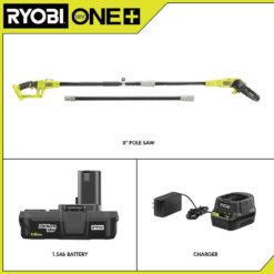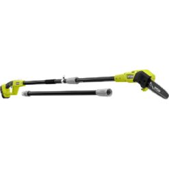 Forget the hassle of oil with the oil-free RYOBI 18V 8 in. Cordless Pole Saw. The oil-free design allows you to enjoy hassle free cutting and is ideal for pruning and limbing around your yard. It extends up to 9.5′, has an angled cutting head, an in-line motor, and a full complement chain giving you faster and more precise cuts to get the job done. For your convenience, it also has tooled chain tensioning with on-board tool storage. This kit is equipped with an 18V 1.5Ah lithium-ion battery and 18V charger. The RYOBI 18V 8 in. Cordless Pole Saw, the 1.5Ah battery, and the charger are compatible with all RYOBI 18V ONE+ products. This tool and battery are backed by a 3-year warranty.