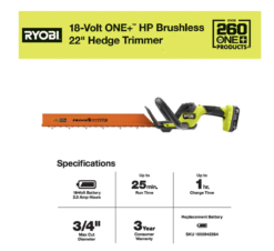 RYOBI P2680VNM ONE+ HP 18V Brushless 22 in. Cordless Battery Hedge Trimmer with 2.0 Ah Battery and Charger