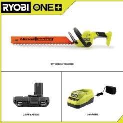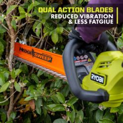 Expand your RYOBI 18V ONE+ System with the 18V ONE+ 22″ Hedge Trimmer kit. The powerful motor provides 3,200 strokes per minute for effortless hedge, shrub, and bush trimming. Enjoy up to 21 minutes of runtime with the included 18V 2Ah battery. Easily tackle thick hedges and branches with 22″ blades and a 3/4″ cut capacity. Experience maximum performance with just the pull of a trigger, without the hassle of gas or cords. Easily clear clippings while you trim with the HEDGESWEEP debris remover. With dual action blades, you can power through hedges with reduced vibration and less fatigue. Best of all, it’s part of the RYOBI ONE+ system – Any 18V ONE+ battery works with any 18V ONE+ product. The hedge trimmer and battery are backed by a 3-year manufacturer’s warranty. This kit includes the P2609 18V 22″ Hedge Trimmer, PBP006 18V 2Ah Battery, PCG002 18V Charger, HEDGESWEEP Debris Remover, Scabbard, and Operator’s Manuals.