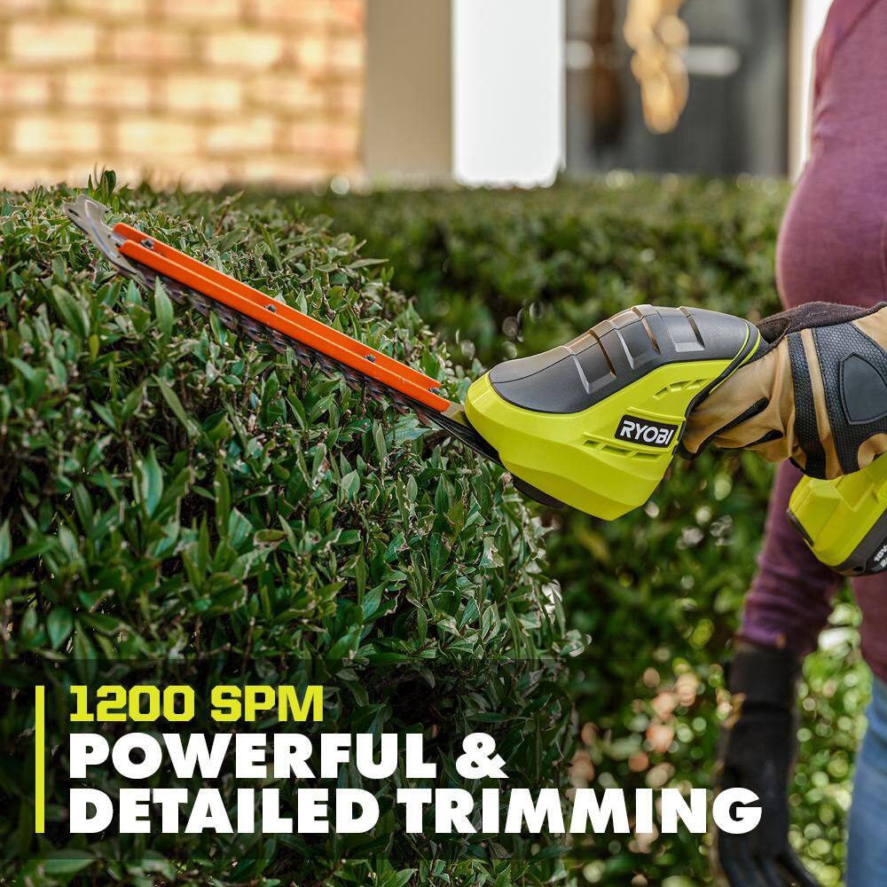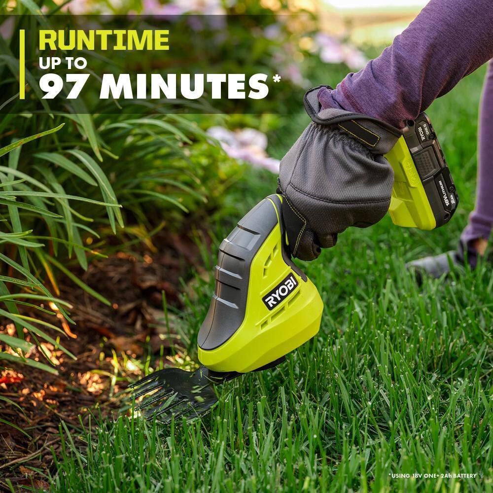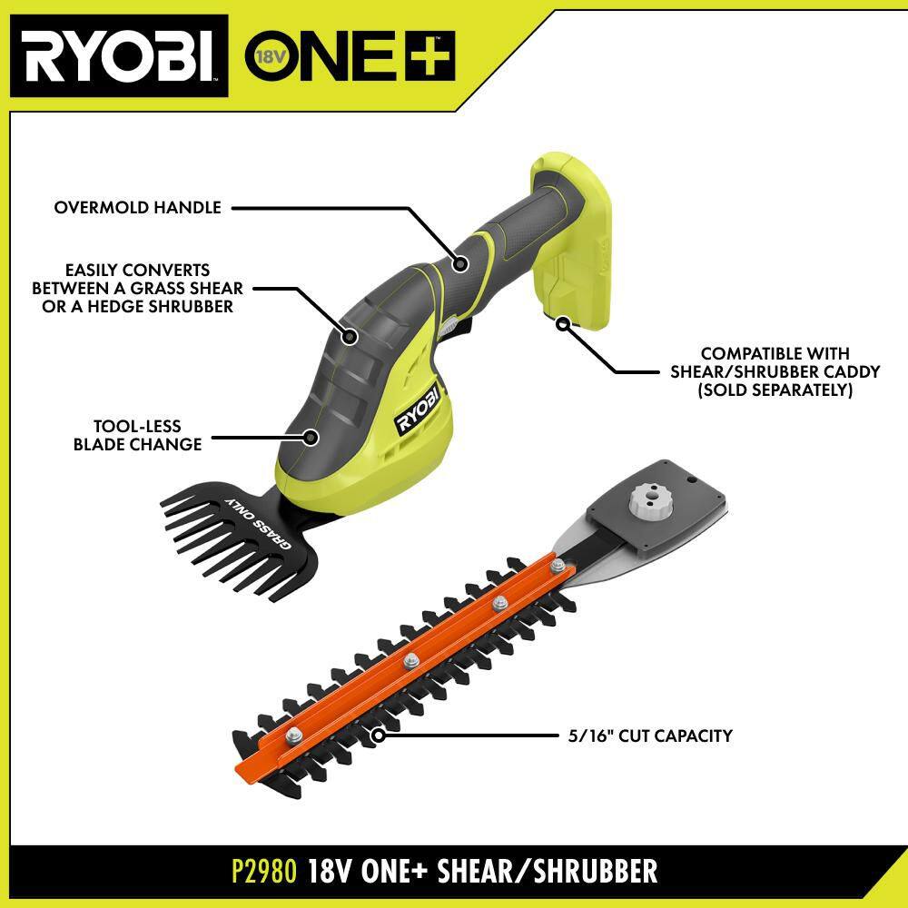 Expand your 18V ONE+ System with the 18V ONE+ Shear/Shrubber kit. The powerful motor provides 1,200 strokes per minute for detailed trimming. Enjoy up to 1 hour and 37 minutes of runtime with the included 18V ONE+ 2Ah battery. Tackle smaller hedges with precision using the 8″ shrubber with a 5/16″ cut capacity. Quickly transition from a shrubber to a shear in seconds with tool-free blade change. Trim patches of grass and weeds in tight areas that your mower can’t reach like around a mailbox or flower bed with the 4″ grass shearing blade. Experience exceptional performance with the pull of a trigger, without the hassle of gas or cords. With dual action blades, you can power through hedges with reduced vibration and less fatigue. The compact and lightweight design reduces fatigue and increases control while working in delicate areas. Plus, this shear/shrubber is compatible with the shear/shrubber caddy, allowing upright cutting for added comfort and added accessibility (caddy sold separately). Best of all, it’s part of the RYOBI ONE+ system – Any 18V ONE+ battery works with any 18V ONE+ product. The shear/shrubber and battery are backed by a 3-year manufacturer’s warranty. This kit includes the P2908 18V Shear Shrubber, PBP006 18V 2Ah Lithium-ion Battery, PCG002 18V Charger, 4″ Grass Shearing Blade, 8″ Shrubber Blade, and Operator’s Manuals.