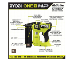 Best of all, it is part of the RYOBI ONE+ System of over 260 Cordless Tools that all work on the same battery platform. This RYOBI P322 18V ONE+ HP Brushless 18-Gauge Brad Nailer is backed by the RYOBI 3-Year Manufacturer’s Warranty and two non-marring pads and an operator’s manual. Battery and charger sold separately.