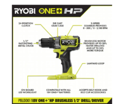 This drill comes paired with a 1/2 in. ratcheting metal chuck for increased durability and accessory retention during heavy-duty applications. The included battery and charger are compatible with all RYOBI 18V ONE+ Tools. Best of all, it is part of the RYOBI ONE+ System of over 260 cordless tools that all work on the same battery platform. This drill/driver is backed by the RYOBI 3-Year Manufacturer’s Warranty and includes the PBLDD01 18V ONE+ HP Brushless 1/2 in. Drill/Driver, (2) 2.0 Ah HIGH PERFORMANCE Batteries, Charger, Bag, and an operator’s manual.