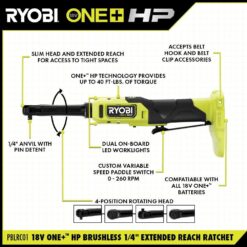 - Includes: (1) PBLRC01 18V ONE+ HP Brushless Cordless 1/4 in. Extended Reach Ratchet and Operator’s Manual