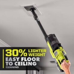RYOBI introduces the 18V ONE+ HP brushless cordless pet stick vacuum cleaner to our cleaning category, providing cordless convenience for floor-to-ceiling cleaning. This improved stick vac not only delivers 2x more suction power but is also 30% lighter and 50% quieter. Combine an intelligent brushless motor with advanced electronics and a high-performance battery (sold separately) and you’ve got a vacuum that runs longer (up to 60 minutes per charge) and more efficiently. The cyclonic filter traps up to 99.9% of dust and allergen matter, including pet fur. LED lights on the roller bar illuminate dust, dirt, and hair. The easy to empty dust cup and removable roller bar allows you to quickly clean and maintain your vacuum. By removing the extension wand, you now have a hand vac for cleaning messes in your car, on your stairs, on delicate surfaces, and in tight spaces with the included crevice tool and dust brush. This vac stands on its own and includes a wall mount to conveniently store your unit after use. Best of all, it’s a part of the RYOBI ONE+ system of over 280 Cordless Products that all work on the same battery platform. Backed by the RYOBI 3-year manufacturer’s warranty, the 18V ONE+ HP brushless cordless pet stick vacuum cleaner includes a crevice tool, dust brush, wall mount, operator’s manual. Battery and charger sold separately.