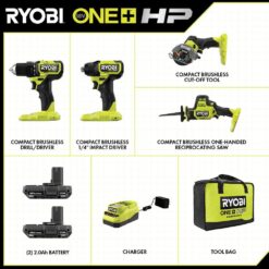 Enter the RYOBI 18V ONE+ System with the RYOBI 18V ONE+ HP Compact Brushless 4-Tool Combo Kit – 1/2 in. Drill/Driver, 1/4 in. Impact Driver, One-Handed Recip Saw, Cut-Off Tool, (2) 18V ONE+ 2.0 Ah Lithium-ion Battery, Charger and Tool Bag. ONE+ HP Technology delivers more power, runtime, durability, and speed utilizing brushless motors, advanced electronics, and HIGH PERFORMANCE lithium technology. Our compact tools are the lightest and smallest we have ever made, while still delivering optimal power to get the job done. The 1/2 in. Drill/Driver is just 6.4 in. in length and delivers 400 in./lbs. of torque. The 1/4 in. Impact Driver delivers up to 1,700 in./lbs. of torque and up to 3,800 IPM. The One-Handed Recip Saw is 13 in. in length and delivers speeds of up to 3,000 SPM. The Cut-Off Tool produces up to 19,500 RPM to cut through tough materials like metal, plastic, tile, cement board, drywall, wire shelving, PVC and vinyl siding. The 18V ONE+ 2.0 Ah Lithium-ion Batteries feature an integrated high visibility fuel gauge to monitor remaining runtime. Best of all, this kit is part of the RYOBI 18V ONE+ System of over 280 Cordless Products that all work on the same battery platform. Backed by the RYOBI 3-Year Manufacturer’s Warranty.
