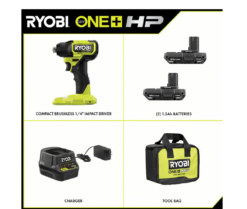 Includes: (1) PSBID01 ONE+ HP 18V Compact Brushless 1/4 in. Impact Driver, (2) PBP002 ONE+ 18V 1.5 Ah Batteries, (1) 18V Lithium-Ion Charger, tool bag, and operator’s manuals