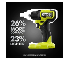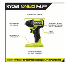 RYOBI introduces the RYOBI PSBID01K ONE+ HP 18V Compact Brushless 1/4 in. Impact Driver Kit with (2) 1.5 Ah Lithium-Ion Batteries, 18V Charger, and Tool Bag. They say the good things come in small packages. You’ll find that’s true with the RYOBI ONE+ HP 18V Compact Brushless 1/4 in. Impact Driver Kit. At a length of just 5.3 in., this tool is 26% more compact and over 23% lighter than the brushed version making it ideal for working in tight spots and completing overhead applications without strain.