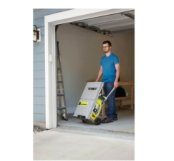 Powerful 15 Amp motor with blade brake - Folding stand with integrated wheels for transport and storage