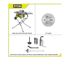 he included folding stand has integrated wheels to provide users with easy portability. Backed by the RYOBI 3-Year Manufacturer’s Warranty, the 15 Amp 10 in. Expanded Capacity Table Saw includes the Folding Stand with mounting hardware, a 10 in. blade, a push stick, a miter gauge, a rip fence, guarding assembly, anti-kickback pawls, and an operator’s manual.