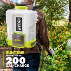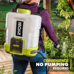 The RYOBI 40-Volt 4 Gal. Cordless Backpack Chemical Sprayer gives you the convenience and comfort to get the job done with no pumping required. For precise application use the variable dial to adjust to your desired pressure. It is equipped with 4 nozzles: adjustable, flat fan, shower head, and dual, for a variety of applications. With a 4 Gal. translucent tank, you are able to easily reference fluid levels and no chemicals will go to waste with its gravity fed design. It is ideal for use with herbicides, insecticides, fungicides, and most other lawn and garden chemicals. There is a comfortable backpack design with padded and adjustable shoulder straps allowing you to comfortably spray around the yard. The RYOBI 40-Volt 4 Gal. Cordless Backpack Chemical Sprayer is compatible with all RYOBI 40-Volt batteries. This tool is backed by a 5-year warranty. Battery and charger sold separately.