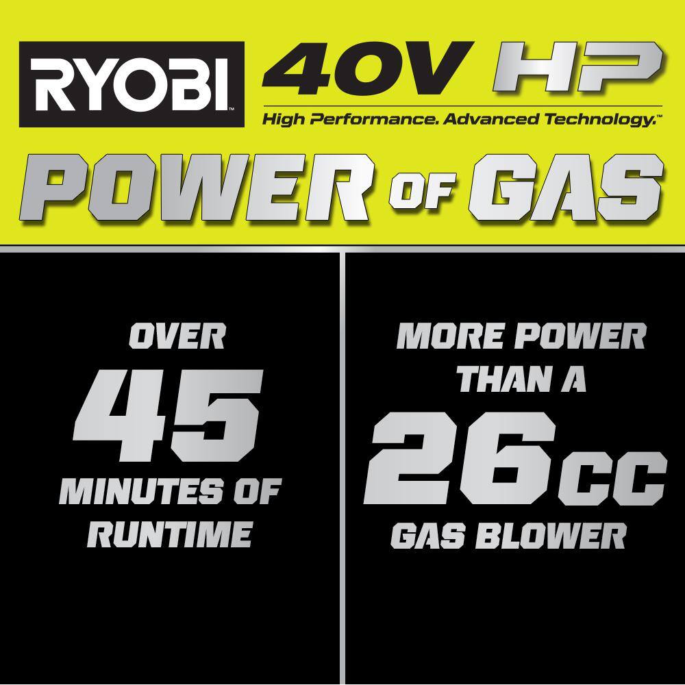 The RYOBI 40V HP Brushless 650 CFM Blower Kit has more power than a 26cc gas blower, delivering exceptional performance without the hassle of gas. 40V HP technology combines a powerful brushless motor, advanced electronics, and lithium technology to deliver 650 CFM and 160 MPH, making it ideal for tough applications, damp/dry leaves, & compacted grass. Achieve 45 minutes of runtime using a 40V 4Ah battery. This blower is part of the WHISPER SERIES and is engineered to be 85% quieter than gas, so you can get work done without disturbing your neighbors. A variable speed trigger gives you maximum control in delicate applications like blowing leaves from mulch beds. Lock in your desired speed with cruise control for less fatigue while in-use and use the included speed tip to achieve maximum MPH. Your 40V 4Ah battery recharges in less than 60 minutes with the included 40V Fast Charger. Best of all, it is part of the 40V System – any 40V battery works with any 40V product. This 40V Blower is backed by the 5-year manufacturer’s tool warranty, 3-year manufacturer’s battery warranty, and includes the RY404014 40V HP Brushless 650 Blower, OP40404 40V 4Ah Battery, OP408 40V Fast Charger, Blower Tube, Speed Tip, and Operator’s Manuals.