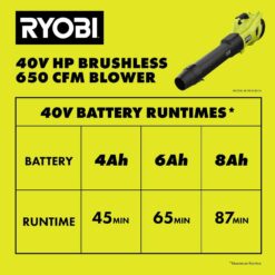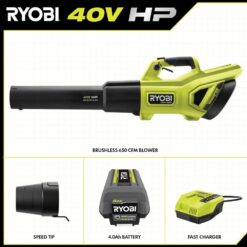 - Includes: RY404014 40V HP Brushless 650 Blower, OP40404 40V 4Ah Battery, OP408 40V Fast Charger, Blower Tube, Speed Tip, and Operator’s Manuals