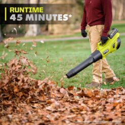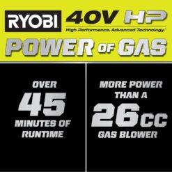 The RYOBI 40V HP Brushless 650 CFM Blower Kit has more power than a 26cc gas blower, delivering exceptional performance without the hassle of gas. 40V HP technology combines a powerful brushless motor, advanced electronics, and lithium technology to deliver 650 CFM and 160 MPH, making it ideal for tough applications, damp/dry leaves, & compacted grass. Achieve 45 minutes of runtime using a 40V 4Ah battery. This blower is part of the WHISPER SERIES and is engineered to be 85% quieter than gas, so you can get work done without disturbing your neighbors. A variable speed trigger gives you maximum control in delicate applications like blowing leaves from mulch beds. Lock in your desired speed with cruise control for less fatigue while in-use and use the included speed tip to achieve maximum MPH. Your 40V 4Ah battery recharges in less than 60 minutes with the included 40V Fast Charger. Best of all, it is part of the 40V System – any 40V battery works with any 40V product. This 40V Blower is backed by the 5-year manufacturer’s tool warranty, 3-year manufacturer’s battery warranty, and includes the RY404014 40V HP Brushless 650 Blower, OP40404 40V 4Ah Battery, OP408 40V Fast Charger, Blower Tube, Speed Tip, and Operator’s Manuals.