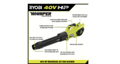 For even more versatility, use the included speed tip to deliver 190 MPH allowing users to quickly clear areas. For convenience, this blower features cruise control, allowing you to blow through yard cleanup without having to hold down the trigger. The included 40V rapid charger, charges your RYOBI 40V batteries 4X faster than the standard charger, charging (1) 40V 4.0 Ah battery within 40 minutes. The RYOBI 40 HP Brushless Jet Fan Blower, the 2 included 4.0 Ah batteries, and the rapid charger are all compatible with over 75 RYOBI 40V products. This blower is backed by a 5-year warranty.