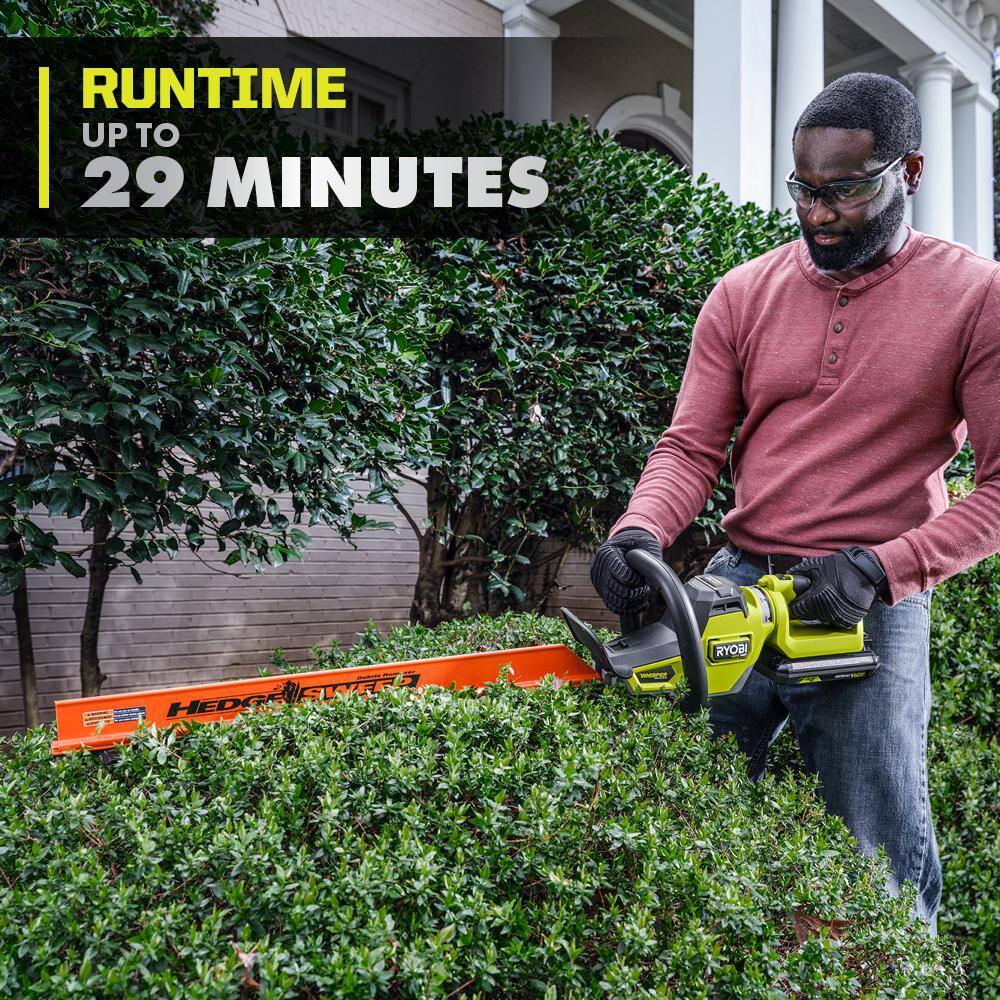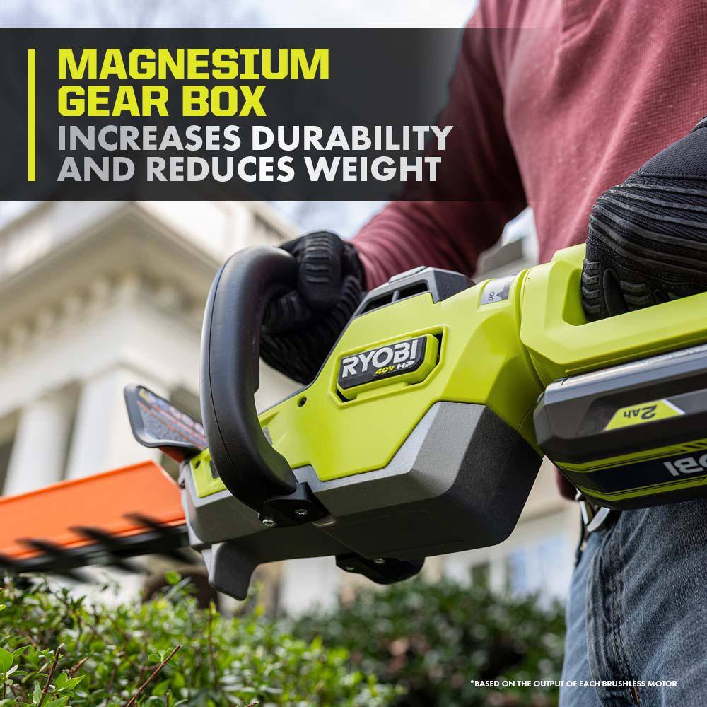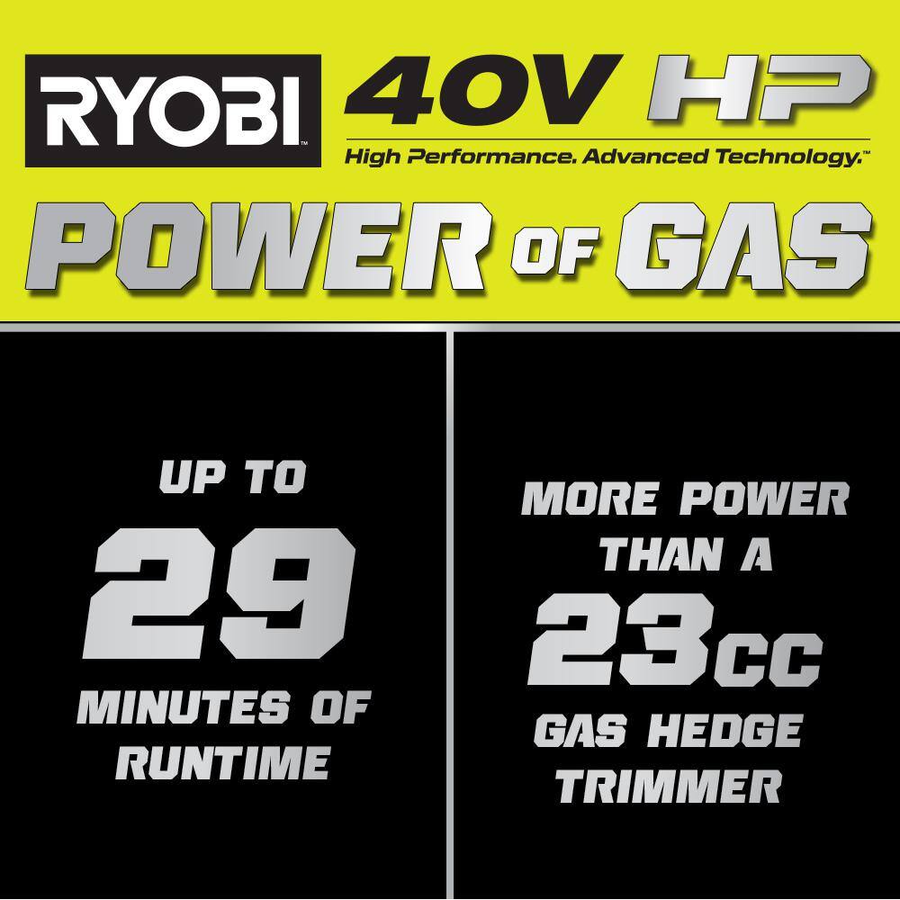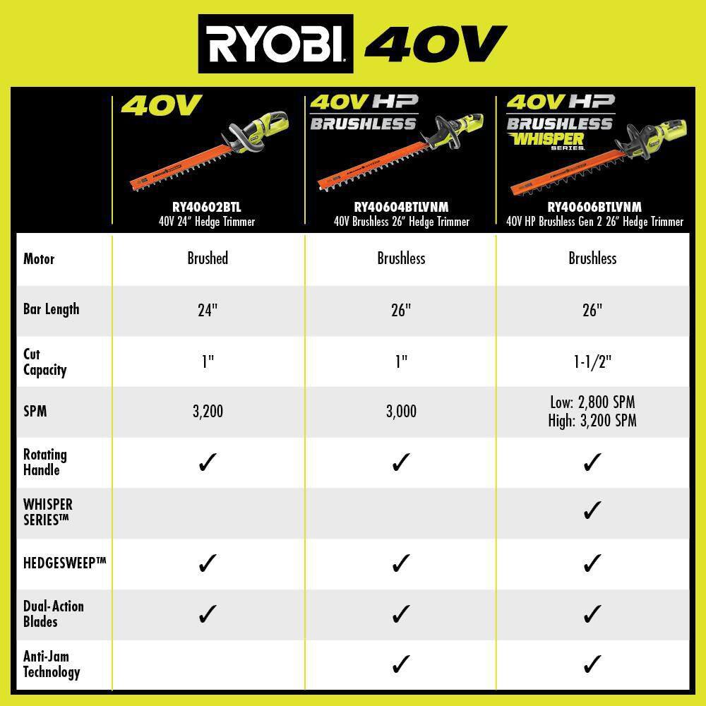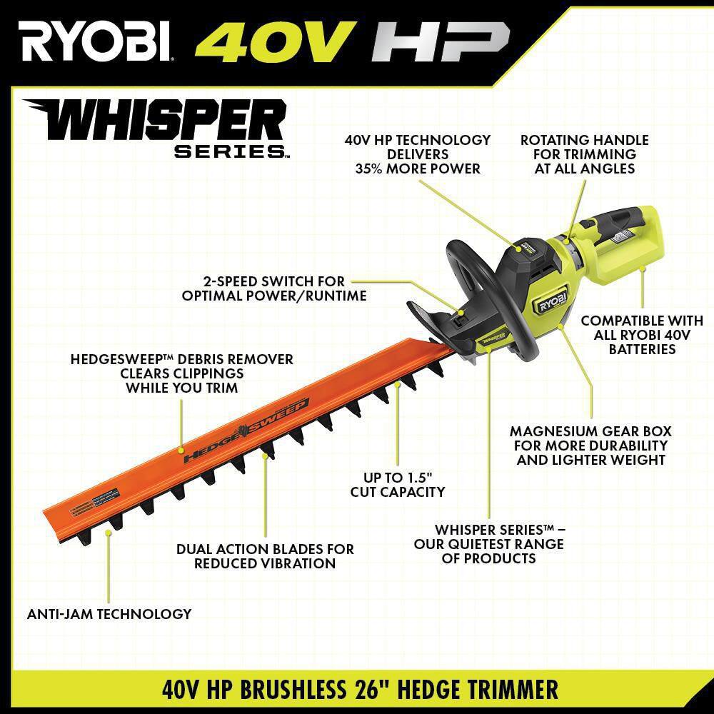 With a cutting speed ranging from 2800- 3200 strokes per minute, the RYOBI 40-Volt HP Hedge Trimmer delivers the performance of gas and longer run time compared to a gas hedge trimmer. The premium HP brushless motor delivers 35% more power than the RYOBI 40-Volt 24 in. Hedge Trimmer. As part of our WHISPER SERIES family this hedge trimmer is among our quietest range of products. The 26 in. blade provides maximum cutting capacity and added reach. The dual action steel blades offer an aggressive 1.5 in. cutting capacity, all while reducing unsafe vibration. A magnesium gear box provides more durability and lighter weight for everyday trimming. There is a 2-speed switch allowing you to choose between cutting speeds for optimal power/runtime Other features include a rotating handle for precision cutting at any angle, along with a wrap-around front handle for ultimate control. Featuring the innovative HEDGESWEEP design that clears clippings and debris while you trim. The RYOBI 40V HP Hedge Trimmer is compatible with all RYOBI 40-Volt batteries. This tool is backed by a 5-Year Tool Warranty.