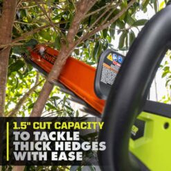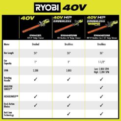 With a cutting speed ranging from 2800- 3200 strokes per minute, the RYOBI 40-Volt HP Hedge Trimmer delivers the performance of gas and longer run time compared to a gas hedge trimmer. The premium HP brushless motor delivers 35% more power than the RYOBI 40-Volt 24 in. Hedge Trimmer. As part of our WHISPER SERIES family this hedge trimmer is among our quietest range of products. The 26 in. blade provides maximum cutting capacity and added reach. The dual action steel blades offer an aggressive 1.5 in. cutting capacity, all while reducing unsafe vibration. A magnesium gear box provides more durability and lighter weight for everyday trimming. There is a 2-speed switch allowing you to choose between cutting speeds for optimal power/runtime Other features include a rotating handle for precision cutting at any angle, along with a wrap-around front handle for ultimate control. Featuring the innovative HEDGESWEEP design that clears clippings and debris while you trim. The RYOBI 40V HP Hedge Trimmer is compatible with all RYOBI 40-Volt batteries. This tool is backed by a 5-Year Tool Warranty.