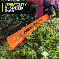 With a cutting speed ranging from 2800- 3200 strokes per minute, the RYOBI 40V HP Hedge Trimmer delivers the performance of gas. The premium HP brushless motor delivers 35% more power than the RYOBI 40V 24″ Hedge Trimmer. As part of our WHISPER SERIES family this hedge trimmer is among our quietest range of products. The 26 in. blade provides maximum cutting capacity and added reach. The dual action steel blades offer an aggressive 1.5 in. cutting capacity, all while reducing vibration. A magnesium gear box provides more durability and lighter weight for everyday trimming. There is a 2-speed switch allowing you to choose between cutting speeds for optimal power or runtime. Other features include a rotating handle for precision cutting at any angle, along with a wrap-around front handle for ultimate control. Featuring the innovative HEDGESWEEP design that clears clippings and debris while you trim. The RYOBI 40V HP Hedge Trimmer includes a 40V 2Ah battery and 40V rapid charger and is compatible with RYOBI 40V batteries. This tool is backed by a 5-Year Tool Warranty.