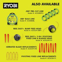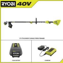 - Includes: RY40PH01 40V Power Head, A54ST01 Straight Shaft Trimmer Attachment, OP40404 40V 4Ah Battery, OP404 40V Charger, Front Handle, Grass Deflector, .080″ Replacement Line, and Operator’s Manuals