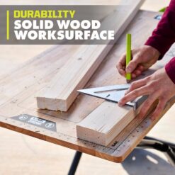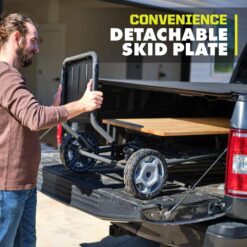 The RYOBI SPEED BENCH Mobile Workstation is a 2-in-1 product, uniquely designed to transform from cart to workbench and back. Effortlessly set up with one fluid motion, allowing you to work and store anywhere. In workbench orientation, utilize the large 42″ x 22″ durable wood work surface with a 400 lb. weight capacity. This work surface allows for 4-sided edge clamping and the ability to mount miter saws and other tools. The work surface also features convenient SAE/Metric measurement and protractor lines to conveniently reference while working. The included LINK Accessory Rails can be mounted in multiple locations, taking advantage of the included LINK Double Organizer Bin and other LINK compatible products and accessories. When your project is complete, convert to cart orientation for compact storage. In cart orientation, the sturdy steel frame and heavy-duty 19” skid plate allow you to transport up to 300 lbs. of products and materials. Equipped with 10″ all-terrain wheels for effortless transport on any work site. Easily store under a truck bed tonneau cover with the tool-free detachable skid plate. The SPEED BENCH Mobile Workstation includes (2) LINK Accessory Rails, (1) LINK Double Organizer Bin, Hardware Pack and Operator’s Manual.