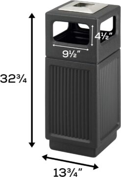 Indoor/outdoor trash can with affordable fluted panel design and features an ash urn with side openings. Waste receptacle with a durable high-density polyethylene with built-in UV inhibitors. The telescoping base hides trash bag. The 15 gallon waste receptacle uses standard 32 x 44″ trash bags. Easily adaptable for anchoring or weighting devices. The receptacle side opening measures 9 ½”W x 4 ½”H. The ash urn style with 9″ square stainless steel ash urn (no sand required).