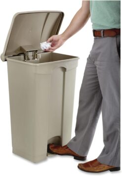 - HANDS-FREE OPERATION. Safco Plastic Step-On Trash Can provides sanitary, hands-free disposal of waste so you never touch the lid. Commercial-grade foot pedal opens the cover easily for waste disposal and lid closes tightly to keep odors contained.