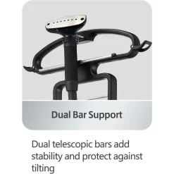 The SALAV Professional Garment Steamer GS49-DJ features a unique stainless steel plated nozzle and dual telescopic bar support for added stability and to protect against tilting. The stainless steel plated nozzle helps deliver hot steam and provides extra pressing power to steam out those wrinkles. The powerful 1500 watt GS49-DJ has convenient power & steam setting pedals that are ergonomically located for easy access. The fashion forward GS49-DJ also contains SALAV patented features including a multifunctional hanger and a double insulated hose to maintain steam temperature and regulate hose surface heat. The GS49-DJ garment steamer also has an easy-to-fill removable translucent water tank with 1.8L capacity to provide continuous steam for up to 60 minutes and heats up in just 45 seconds.