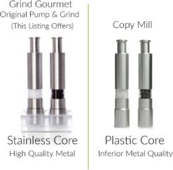 - FORM AND FUNCTION EXQUISITELY PAIRED Grind Gourmet is the creator of the Original Pump & Grind salt and pepper grinder set. Similar looking mills on the market are evidence of Grind Gourmet’s success however Grind Gourmet mills are made with a superior quality stainless steel, the core is solid steel not plastic so pressure from grinding will not cause the mill to break. Once you use these mills you’ll never want to be without them. Enjoy our environmentally friendly pepper grinders.