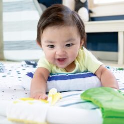 This is the first tummy time product that actually ‘tells mom how to!”. It provides instructions to caregivers of how to do tummy time From birth to six months. This versatile mat features two flexible arches that start as a border around the mat for tummy time play and then stretch over baby with dangling toys, encouraging your curious little one to reach and play. The toys detach so you can bring them with in the car seat or stroller for more playtime on the go.