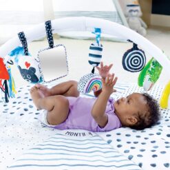 - 12 ACTIVITIES ENCOURAGE LEARNING THROUGH PLAY: Includes baby safe mirror with back easel for self-discovery, 3 high-contrast attachables: rattle, squeaker & bear plush, removable rainbow chime, textured teether, 4 crinkle flags, 3 textured peek-a-boo flaps, 4 tactile ribbon rings, and a 2-sided pillow prop. Many toys are removable for take-along play