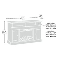 Say goodbye to goosebumps. Add warm and inviting style to any room in your home with this entertainment/fireplace credenza from the Cannery Bridge collection. It accommodates up to a 60″ TV, making it ideal for watching your favorite shows, the big game, or for an all-day movie marathon. Add a twist and use this handsome credenza as a place to display your favorite home decors items like an accent lamp, sweet-smelling candles, knick-knacks, and much more! It features divided open shelving that is perfect for holding audio and video components. Behind each framed, panel door is a hidden storage area that includes an adjustable shelf that can be moved to different heights to create versatile storage options for items of all shapes and sizes. It also features a cord management system so you can keep all your wires neat and out of sight. The electric firebox with remote control and built-in overheat protection heats up to 400 square feet of your home. Finished in Lintel Oak, this stunning entertainment/fireplace credenza is the best combo since peanut butter and jelly. It will be the center of attention in your home.