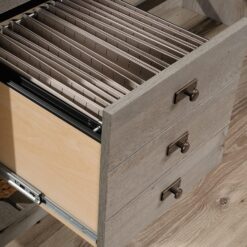 Update your home office with this L-shaped desk from the Cottage Road® collection. The spacious work surface of this home office desk has room for your computer, pens, binders, folders and a little home décor. Two drawers feature full extension slides for desk essentials and convenient storage options. The lower drawer holds letter-size hanging files, so your important documents are never hard to find. This L-shaped office desk features a lower, open shelf for additional storage of books or an organizing bin. A tidy workspace is crucial, that’s why this wood L-shaped desk comes equipped with two desktop grommets to keep your home office clutter free of electronic cords. This farmhouse style wood computer desk is finished on all sides for versatile placement in any room of your home. This allows you to rearrange and revamp as often as you want—your desk will look good from every angle. Finished in Mystic Oak®, this L-shaped desk with storage breathes new life into and new meaning into the home office.