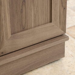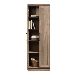 Whether you need more storage in the pantry, basement, garage, or guest room, this tall storage cabinet with doors will look great no matter where you place it. An enclosed back panel with cord access makes charging your tools, phone, tablet, or laptop easy and keeps your place free of cord clutter. Adjustable base levelers ensure that your two-door storage cabinet is level, even if the floor is not. Finished in Salt Oak® with framed panel doors, this stylish wood storage cabinet is the perfect storage and organization solution for any room in your home.