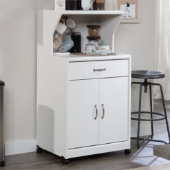Add to your kitchen counter space without breaking the bank with this microwave kitchen cart from the Sauder Select collection. This kitchen cart with microwave shelf features a dedicated area for your microwave oven to avoid taking up valuable space on your kitchen counters. This kitchen cart microwave stand also has a spacious top shelf for additional display and storage of plates, paper towels, decor, and more! This kitchen microwave cart also includes a drawer with metal runners and safety stops to hold essential kitchen or pantry items. The lower hidden storage area behind the doors features an adjustable shelf for storage of other kitchen gadgets or extra cereal boxes. Dual-wheel casters for easy mobility allow you to move the cart from room to room, or corner to corner, depending on your needs. An enclosed back with cord access allows for easy pass through to avoid cord clutter. Assembly is quick and easy with a T-slot drawer system. Finished in Soft White, this multifunctional, white microwave kitchen cart will have you organized in no time.