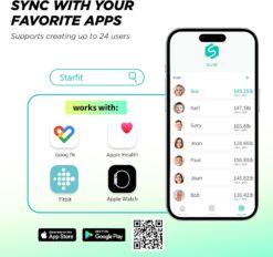 - One Scale Unlimited Users: Starfit App allows you to create unlimited profiles 24 Users for your family and friends with only one smart scale. Starfit App also can easily sync with other fitness Apps like Apple Health, Google Fit, Samsung Health, Fitbit and so on.