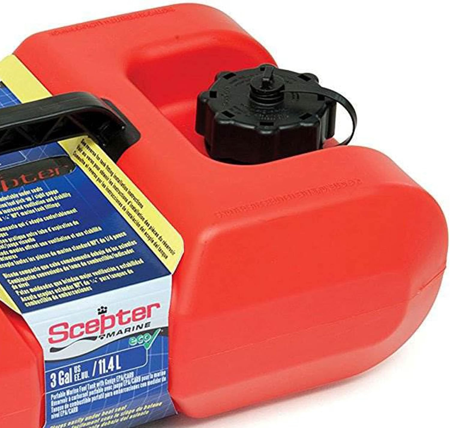 The Scepter 3-Gallon (11.4 Liter) Portable Marine Fuel Tank is the perfect solution for extending your time on the water. Designed for small boats and outboard boat motors, this durable gasoline can provides ample fuel capacity while the slim profile makes for convenient under-seat storage. Its shape is designed to prevent tipping. The innovative 2-way vented cap ensures safe operation by allowing air flow while refueling and automatically releasing pressure above 5 PSI to prevent vapor buildup. Built with a rugged, crush-resistant HDPE shell, this jerry can resists rust, corrosion, and UV damage, making it ideal for harsh marine environments. The built-in fuel gauge allows for quick level checks, and the tank is compatible with standard 1/4 NPT marine fittings for easy use with any boat engine. Fuel line and fittings are sold separately. Integrated top handle makes lifting, carrying, and securing the tank effortless, ensuring safe fuel transport. Please note this tank can not be mounted horizontally. Whether you’re cruising or fishing, this portable boat motor fuel tank keeps you powered for longer adventures. Scepter is the global leader in the design and manufacture of innovative and high-quality marine tanks, parts, and accessories.