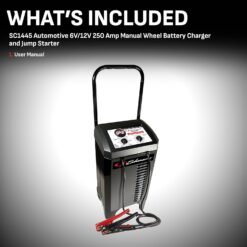 - In the Box: With your purchase, you will receive the Schumacher SC1445 250 Cranking Amp 6-Volt/12-Volt Wheeled Battery Charger and Jump Starter and user manual