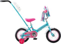 - Perfect for young kids learning to ride, 12-inch wheels ideal for riders 28-38 inch tall, bicycle includes training wheels and easy-steer push handle for added support and control