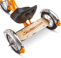- The rear deck is made of genuine wood with burnt in Schwinn logo, while the scalloped chrome fenders provide a fashionable ride