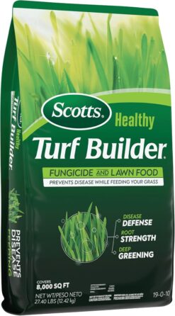 - Coverage: One 27.4 lbs. bag of Scotts Healthy Turf Builder Fungicide and Lawn Food covers up to 8,000 sq. ft. of lawn