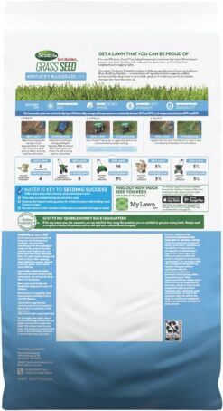 Scotts® Turf Builder® Grass Seed Kentucky Bluegrass Mix is an elite species that grows dense, green turf. This mix contains Root-Building Nutrition, a combination of ingredients that is expertly crafted to help establish deep roots to grow thick, green turf so that you can build a better, stronger lawn from the roots up. Scotts® Turf Builder® Grass Seed Kentucky Bluegrass Mix is designed for full sun and light shade, and has medium drought resistance with high durability. It can be used to seed a new lawn or overseed an existing lawn. For best results, apply in the spring or fall when daily average soil temperatures are consistently between 55°F and 70°F or air temperatures are between 60°F and 80°F. We recommend using a Scotts® spreader to apply this product (please refer to spreader settings on product label). Water daily or as needed to keep the soil surface moist until the seedlings reach at least 2 inches tall. One 5.6 lb. bag of Scotts® Turf Builder® Grass Seed Kentucky Bluegrass Mix has a new lawn coverage of 1,240 sq. ft. and an overseeding coverage of 3,730 sq. ft.