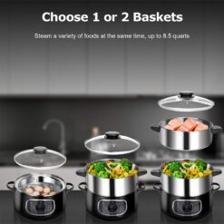 Secura 2 Stainless Steel Food Steamer 8.5 Qt Electric Glass Lid Vegetable Steamer Double Tiered Stackable Baskets with Timer